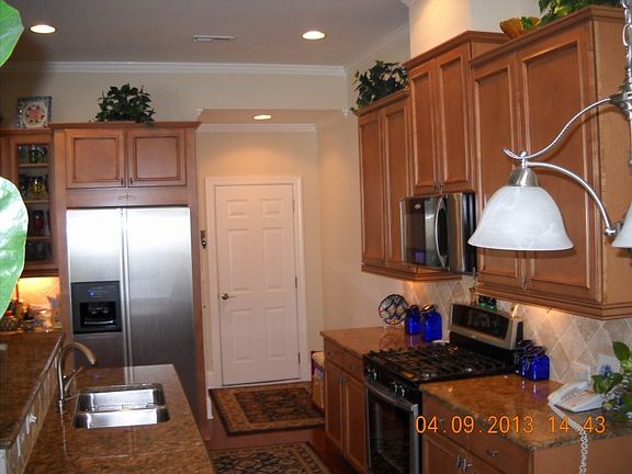 Interior Stone Creek Village Luxury Townhome with screened porch and 2 car garage. Mocha maple cabinets in gourmet kitchen with stainless steel appliances. Tiled whirlpool garden tub and separate shower in oversized master bedroom suite with plush carpeting on 2nd floor, Birch Clove hardwoods on first floor. Plenty of storage space and gas fireplace in living room. Easy walking distance to shopping, restaurants and greenway paths. Neighborhood Description small quaint shopping village with Harris Teeter, restaurants and boutiques.