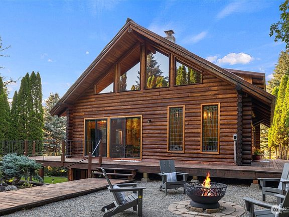 Beautiful log home gracefully set on 3.2 serene acres, offers a perfect fusion of rustic charm and contemporary conveniences. With 3 bedrooms, 2 baths, and a versatile bonus room, this property is thoughtfully designed for both everyday living and joyful entertaining. Step inside to be greeted by soaring vaulted ceilings, a cozy wood-burning stove, and unique stained-glass windows that lends a touch of artistic beauty. The property boasts a 2-car attached garage along with a separate 1,050 sq. ft. 3-bay garage with loft storage—plenty of space for all your projects and treasures. Outside, the lush grounds beckon with mature evergreens, maples and fruit trees. Savor the views from the wrap-around porch or find peace relaxing by the pond.