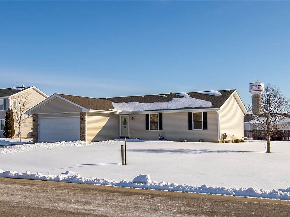 3 BR 2 BTH open concept ranch in Davis Junction w/Meridian Schools. Reap the benefits of small town living and still be minutes to I-39 and Route 251! This immaculate ranch is move in ready w/new gleaming hardwoods in great room, hallway, and all three bedrooms. From the tiled foyer you gaze into the great room with cathedral ceiling and updated gas fireplace. The large eat in kitchen has stone tile backsplash. Sliders lead out to 18x20 stamped concrete patio. Open staircase w/hardwood stair treads lead to lower level waiting for your ideas! New lighting throughout. New toilets and fixtures in bath. New concrete sidewalk. Corner lot on culdesac. Neutral décor and well maintained and ready for you to move right in!