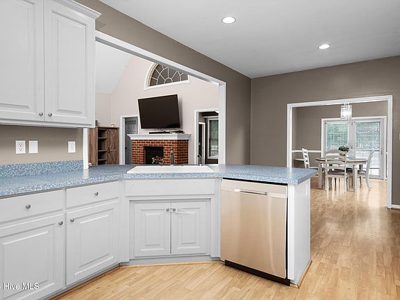 Inside, you'll find an airy open floor plan with luxury vinyl plank flooring, vaulted ceilings, and recessed lighting that enhance the home's warm and welcoming feel. The living room, anchored by a classic brick fireplace, invites you to relax and unwind.