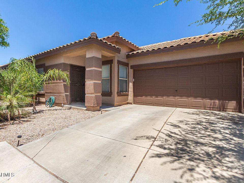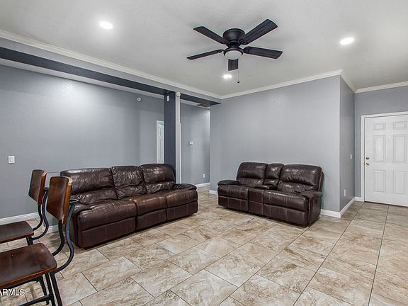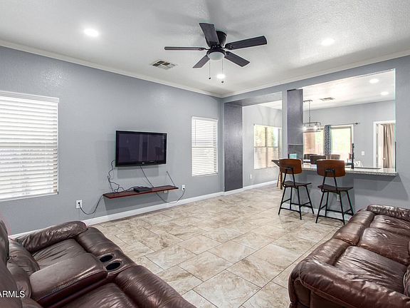 Come and see this charming 3-bed, 2-bath single-level property in Arizona Goldfield. Take a look at the wonderful interior with crown moulding throughout, sooting palette, wood-look & tile flooring in all right places, and a welcoming living room. Cook your favorite meals in the eat-in kitchen, featuring white cabinets w/crown moulding, granite counters, stone accented backsplash, a breakfast bar, SS appliances, a walk-in pantry, and backyard access. The primary bedroom offers a walk-in closet and a private bathroom. Large backyard can be turned into whatever your heart desires. Create lasting memories in this dream home! Call now before it's gone!