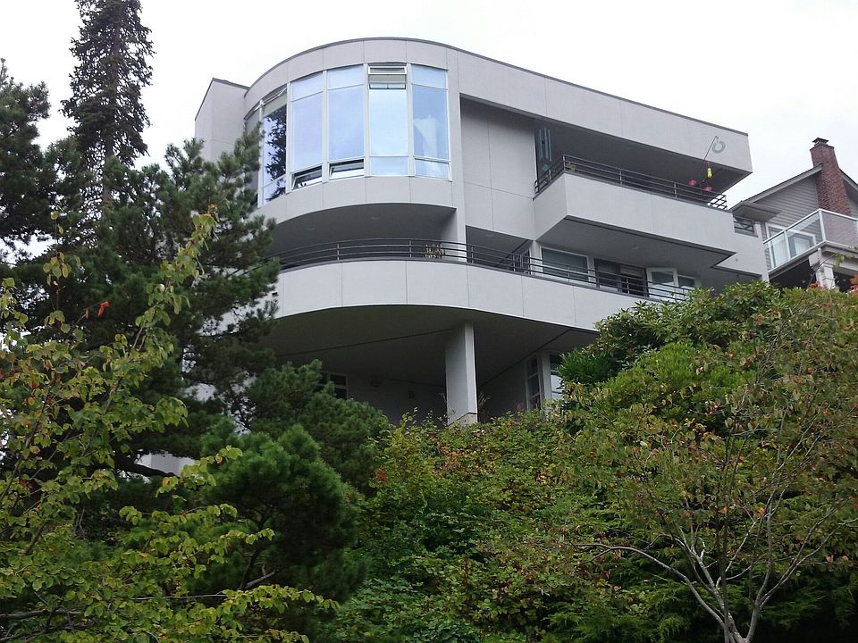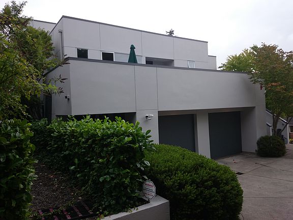Home sits on slope high above street level with commanding 180 view of Lake Washington including Mount Rainier. Home is a five level split with main living areas east and guest apartment over 2 car garage to the west. An open kitchen, living and dining room with eating deck look out over the lake with master bedroom, large spa deck and office/media room below. Two smaller bedrooms with exercise room at lowest level. Each bedroom has its own sink. Storage includes two in house areas and large area within garage. Drive comes off alley. Solar power and 240 amp auto charger.