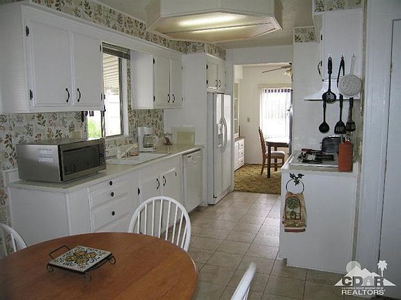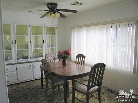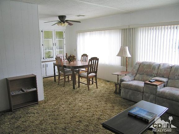 This 2 bedroom, 2 bath, 1978 Silvercrest model home is being offered at a great value at only $76,900. It is located within walking distance to the Clubhouse and is being sold furnished, turn-key. It offers a composition shingle roof, central heat and air conditioning, appliances (as shown), a newer white vinyl fence on the covered carport side that is nicely landscaped and a covered patio with a privacy block wall and security wrought iron gates on either end. Enjoy unlimited golf for two deeded owners plus swimming pools, hot tubs, tennis courts, pickleball, shuffleboard and a newly renovated Clubhouse with restaurant & bar for one monthly maintenance fee. Come see the improvements at Tri Palm Estates & Country Club and have some fun in this active 55+ golf course community.