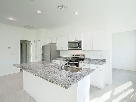 Welcome to your dream home in the heart of Lehigh Acres, FL. This brand new, move-in ready home boasts three spacious bedrooms, two full bathrooms, and a den that could serve as an office or guest bedroom. The split floorplan ensures privacy, while the large great room is perfect for entertaining. The kitchen is a chef's dream with a full appliance package, stainless steel appliances, plenty of cabinets, a pantry, and a large island. The primary suite is a haven with dual vanities, a large tiled shower, and his and hers closets. All rooms are bathed in natural light, enhancing the tile floors and modern fixtures throughout the home. The covered lanai and expansive backyard offer ample outdoor space. The home also includes a two-car garage with an opener and impact windows for safety. Rest assured your family will be safe during any storm. This pet-friendly home is conveniently located close to downtown Lehigh, SR 82, and all amenities in Lehigh Acres, making commuting to Fort Myers a breeze. Don't miss this opportunity to be the first to call this gorgeous single-family home yours. See it today!