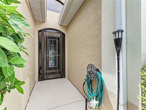 Gorgeous former 3/2/2 plus a den Model Home in Timberly now available!! This home has all the fine touches and no expense was spared. The lake view is to die for. As you enter the home you notice the tile inlay in the foyer and rich ceiling detail above. The family room and dining room has a tray ceiling wrapped in crown molding. The kitchen is spacious with plenty of cabinet and counter space. The beautiful hard wood cabinetry and stainless steel appliances match the warm quartz counter tops perfectly. All the living areas have the tile laid on the diagonal and crown molding throughout. The owners have added many fine touches to include: screened front entry door, remote controlled blinds in the living room and on the extended lanai, an extra concrete pad which is perfect for bird watching or or watching the sunset over the pond. The owner is leaving the chandelier and the top of the line fans throughout the home. This home has pocket doors throughout. The washer and dryer and garage storage stay with the home. This home is truly a one of a kind and Timberly is a highly sought after maintenance free community with a community pool and close to shopping and major interchanges.