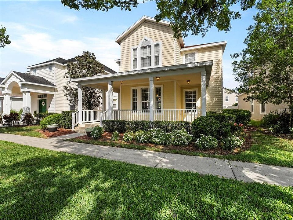 New roof installed February 2022, brand new carpet and in walking distance to Harmony Community School! Property also comes with a home warranty! Step into the perfect blend of comfort, style, and serenity in the "original" Harmony in this beautiful two-story, three-bedroom home. With two and a half bathrooms and a two-car garage, this property has everything you need. Lovely covered front rocking chair porch. Rear covered porch and covered breezeway to garage has comfort and private sitting space to enjoy the outdoors. As you enter the home you will notice the dark engineered hardwood flooring flows through an open floor plan through the living room and dining room. The living room has a lovely built in bookcase with a spot for TV. Kitchen features 42" wood cabinets, solid surface counter tops, recessed lighting, closet pantry and breakfast bar overlooking dinette. All spacious bedrooms are upstairs. The owner's suite offers a walk-in closet, double vanity, garden tub, & separate shower. The downstairs inside laundry room near the back door. Enjoy your private fenced back yard. Living in this harmonious community means an abundance of amenities right at your doorstep. Buck Lake features community-owned boats, or relax on the fishing pier. Take a moment of serenity in the rocking chairs, or enjoy a relaxing on the bench swing. There are walking trails, dog parks, playgrounds, sand volleyball court, basketball courts, and even a ping pong table. And that's not all—two community pools await your splashy adventures, along with access to the picturesque Harmony Preserve Golf Course for golf enthusiasts. Top-Rated Schools: Families will appreciate the top-rated schools available in the area, including Harmony Community K-5, Harmony Middle School, and Harmony High School. Don't miss out on this opportunity to live in perfect harmony. Don't miss out on the opportunity to experience the perfect harmony of life in this fantastic community. Schedule a viewing and take the first step toward living the Harmony lifestyle you've been dreaming of! CDD amount is included in the total tax bill. Buyer to verify all room measurements.