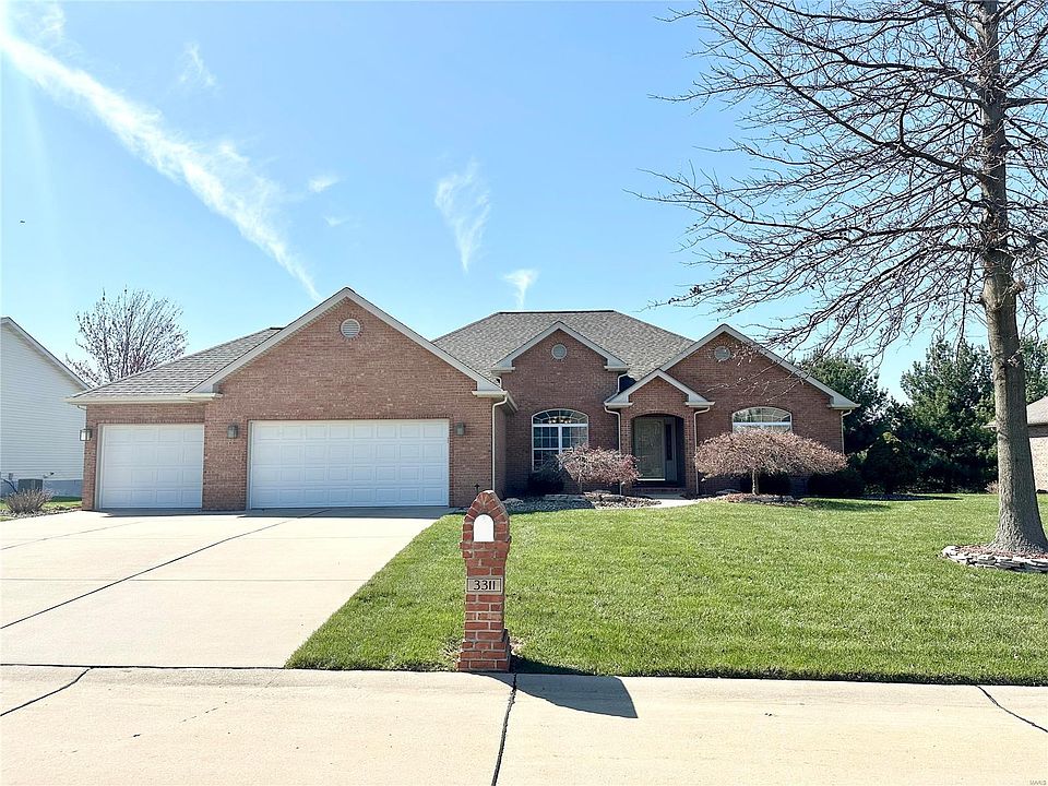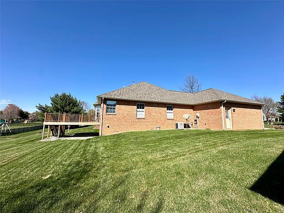 Welcome Home! Extremely well kept, original owner Atrium style ranch. 3-sided brick with 3-car garage. 4 bed, 3 bath with partially finished daylight basement. Vaulted ceiling in living room with wall of windows in back and remote blinds. Built-in shelving and cabinetry for storage around gas insert fireplace. Large kitchen, SS appliance and breakfast bar. Master suite has big walk-in closet, separate tub/shower with double vanities. Split bedroom floor plan with two bedrooms and bath on other side of house. Basement has large family room, bedroom and full bath. TONS of storage in unfinished section or room to finish more of the basement if preferred. Beautifully landscaped. Finished walls in large 3 car garage with side door. Deck has new maintenance-free railing. New Roof in 2023. New HVAC 2022. Don't miss out on this Gem. Schedule a showing today!