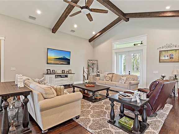 WELCOME HOME to this beautiful 2017 built home on almost 3 ACRES of private, tree-shaded property ready for your family to enjoy! Stroll along the front walk past colorful, vibrant LANDSCAPING and STONE ACCENTS onto the roomy FRONT PORCH just waiting for you and loved ones to sit a spell. The VINYL BEAD BOARD porch ceiling with canned lighting is just the detail needed for this space. Beyond the 8' CRAFTSMAN style front door beckons a large, open LIVING ROOM highlighted by distressed WOOD BEAMS, CROWN MOLDING, 6" baseboards and HARDWOOD FLOORS. Imagine the aroma of special family meals prepared in your fabulous KITCHEN complete with a 9'x4' GRANITE-topped island, WOOD CABINETS with soft-close drawers and pull-outs, black STAINLESS appliances, custom range hood, tile BACKSPLASH and huge WALK-IN PANTRY. Custom BUILT-INS and a WINDOW BENCH line one wall of the DINING ROOM offering a great setting for family meals. Rest awaits in your stunning MASTER SUITE that includes not only a SPACIOUS BEDROOM, EN SUITE BATHROOM with granite-topped vanity, makeup area and 4-HEAD WALK-IN SHOWER, but also a WALK-IN CLOSET with California Closet style organizing system, chandelier and a window. BEDROOMS 2 and 3 each with WALK-IN CLOSETS are located on the other side of the home near the GUEST BATH with a tub/shower combination. Entering the home from the 3-CAR GARAGE brings you into the MUD ROOM with PORCELAIN BRICK TILE floor, BUILT-IN DESK and CUSTOM BENCH with hooks. Memories are waiting to be made upstairs in the 33'x12' BONUS ROOM. Also upstairs is BEDROOM 4 currently used as a craft room. The half bath with MARBLE floor is accessible right off the Living Room. Natural light cascades through a well-placed window brightening the indoor LAUNDRY ROOM with SUBWAY TILE BACKSPLASH and plentiful cabinets for storing supplies. Beautiful FRENCH DOORS transition from the Living Room to the Covered, Brick-Pavered PATIO with ceiling fan for enjoying the sprawling back yard view. Other features include an Electric AUTO-CLOSE GATE, CONCRETE DRIVEWAY, 5 TON A/C EXPANSION SYSTEM that allows cooling upstairs and downstairs separately, 10 foot ceilings downstairs and 8' ceilings upstairs, built-in blinds in all exterior doors, rain gutters in front and back, coated chain-link fence along roadway, belt-driven wireless garage door openers, security system, concrete pad under the air condensor, security lights at four corners of the home, a preferred OZONE WATER TREATMENT SYSTEM, underground electric and cable, and real wood on all window casings door casings and trim. Visit today to see all that this home and property has to offer your family!