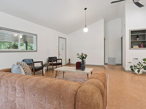 Discover the perfect balance of mid century design and serene living with this updated 2-bedroom, 1-bath ranch sitting on 2 private acres! The exterior has been freshly painted and Inside you'll find vaulted ceilings, cork flooring, and mid-century touches that create a bright, open feel. The remodeled kitchen stands out with butcher block counter tops, sleek cabinetry and a wood-slat accent wall, while the bathroom is fully updated with modern finishes paired with tile floors and shower. The finished basement adds extra living space and a laundry room. Outside, enjoy a covered porch, gazebo with string lights, three outbuildings for storage or hobbies, and a carport. Private, modern, and move-in ready just minutes from town.