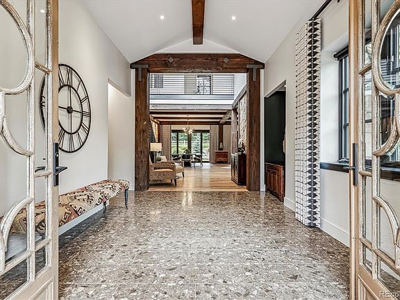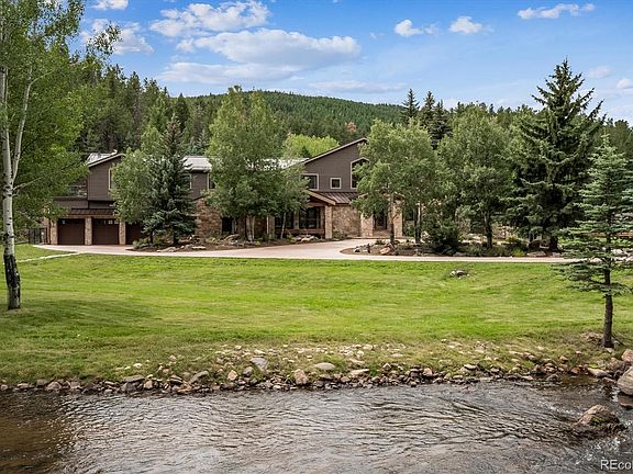 Absolutely breathtaking residence on Upper Bear Creek with a river running through the property and Mount Evans Views! This home sets a new standard for a mountain property. Entering the gated premises, you cross Upper Bear Creek & meander up the heated driveway. Greeted by 200 year old French doors, this magnificent property immediately greets with Terrazzo and European Oak wired brush flooring, soaring ceilings, stone accents, state of the art lighting, large windows and views galore. The main floor boats a spacious Living and Dining room, two generously sized office spaces easily used for multiple purposes, a grand eat in Kitchen w/ an envious Butler's pantry & laundry, an ensuite bedroom, exercise room, two powder rooms and a brand new elevator to all levels. The second floor has a spectacular Primary Suite w/ private balcony, two walk in closets and a fireplace. The Primary bathroom has exquisite finishes, a walk in shower & double vanities. On the second level, there are three additional ensuite bedrooms, another office, a powder room, and a splendid entertaining room with wet bar, multiple seating areas, a double sided fireplace, and a private deck. The mudroom and two attached garages w/ 5 bays are on the lower level. Meticulously updated with a generator fit for a commercial property, a new metal roof w/ heated gutters, fire mitigation throughout, sprinklers inside and out, a Control 4 system, two new boilers, and a new commercial grade central air conditioning system with 9 air handlers, 4 condensers, and 9 zones, all with humidity has been installed. Hydronic Baseboard heat and radiant floors heat home beautifully. A new fence, french drains, bridges & landscaping perfect the outdoors. This property includes a high tech water treatment system, new pump house, water rights & the lot next door with additional water rights. 40 minutes to Denver, 1 hour to ski resorts & 10 min to downtown Evergreen. A unique, picturesque residence for the discerning buyer!