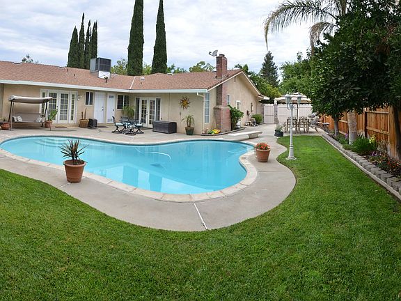 Get ready for outdoor entertaining around the pool at this 4-bedroom/2-bath 1976-SF North Merced home near Black Rascal and Rahilly Parks. This open floor plan delivers a magnificent living room with tile floors, comfortable family room with wood-burning fireplace, tasteful dining room, kitchen with gas range, custom cabinets, breakfast bar, double ovens for big dinners, marble countertops, microwave, French double doors, new paint, patio, RV parking, shed, double-glazed windows, 2-car garage, flower garden, a sprinkler system, mature plants, fenced back yard for the kids. This home shows wonderful attention to detail and real pride in ownership.
