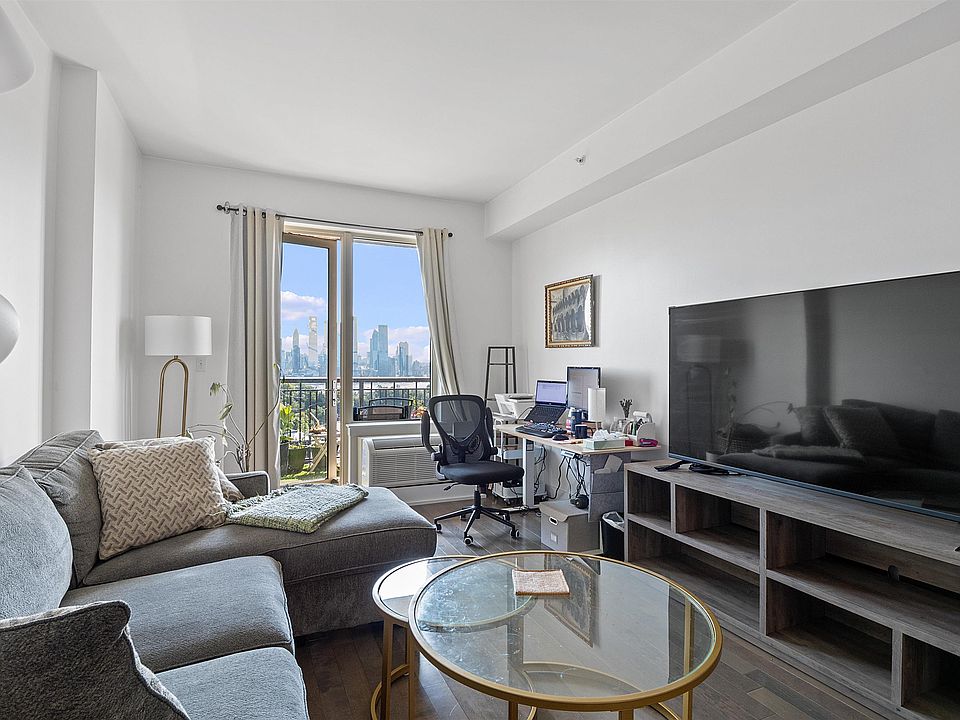 Welcome to The Thread! Step into this exceptional 1-bedroom apartment with a generous den that can be used as a second bedroom or a home office. Spanning over 900 square feet, this residence offers stunning east-facing views of the Manhattan skyline. The unit features elegant hardwood flooring, a modern kitchen with stainless steel appliances and granite countertops, and a spacious living area that opens to a charming dining nook. Enjoy your own private balcony with captivating views of NYC sunrises and sunsets. The large bedroom includes a walk-in closet and a full en-suite bathroom. Benefit from top-tier amenities, such as a 24-hour lobby attendant and concierge, three elevators, a well-equipped fitness center, a playground, a dog park, a community lounge, and an outdoor space with grills. Conveniently located with easy access to Manhattan and major highways, you'll also be close to shopping, cafes, grocery stores, and Hoboken. Garage parking available upon request. Don't miss the opportunity to make this lovely apartment your new home!