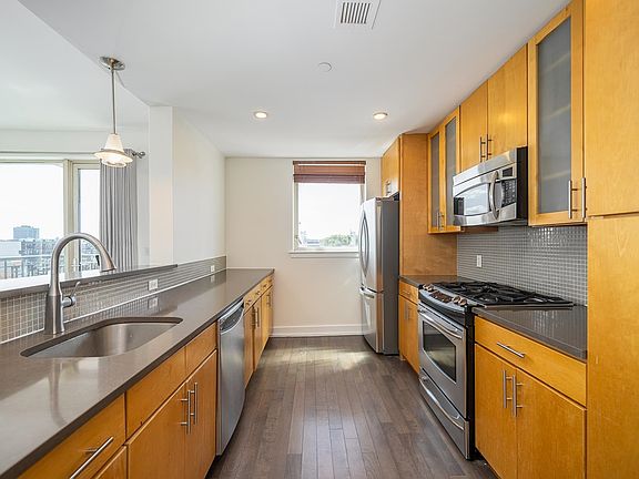 Welcome home to The Thread. This Spacious South West corner condo w/ NYC views. Generous open concept floor plan w/ 2 bedrooms and 2 baths has h/w floors throughout and recessed lighting. Kitchen offers an abundance of cabinetry, stainless steel appliances including a six burner gas stove and quartz countertops with breakfast bar. It opens up to the living and dining room areas then flows seamlessly to your oversized private terrace where you can enjoy your NYC views. Master bedroom is complete with an en-suite bath and walk-in closet with container store organization. Spacious second bedroom can also be used as a den or office. Freshly painted home w/recessed lighting, washer/dryer and garage parking complete this home. The Thread is an elevator building with a 24/7 concierge. It's amenities include a fitness center, community room with pool table and an outside area with barbecue. The location of this home is a commuter's dream and provides easy access to New York City. Convenient to restaurants, stores and more!