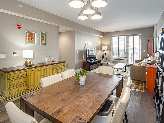 Tastefully appointed 2 bedrooms and 2 bathroom condo at The Thread. This west facing condo features one of the largest 2 bedrooms floor plans in the building with an open concept kitchen and living room. Kitchen features SS appliances with plenty of countertop space and quartz countertops. Both bedrooms are bright and airy. Additional features include modern bathrooms, balcony, in-unit washer & dryer, gleaming hardwood floors throughout, abundance of storage and closet space and 2 car garage parking. The Thread amenities include 24HR doorman & security, community room, kids play area, and the fitness center. Bus to NYC is just a block away for a quick & easy commute to Port Authority.