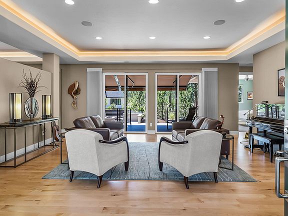 Exquisite single level Frank Lloyd Wright inspired contemporary prairie style home incorporating his design aesthetic of clean lines and interiors emphasizing sophistication and warmth while minimizing wasted space. Sitting on .40 acres on a quite cul-de-sac and landscaped to compliment the natural surroundings, the front entry opens to a warm interior that brings the outdoors in with floor to ceiling windows. Maple flooring, recessed lighting, gourmet kitchen with custom cabinetry, numerous built-ins, and a cooking island designed to interact with guests, reflect Wright's belief that a home should be beautiful while being practical. The primary suite continues this aesthetic with large windows and access to the deck/patio; dual sinks; lg walk-in shower w/ a privacy wall and a walk-in custom closet w/ built-in dressers. Deck & patio includes a spectacular waterfall, gas firepit, ceiling fans and speakers, and retractable awning. An 891 sq.ft. garage includes a gear-bay for your toys.