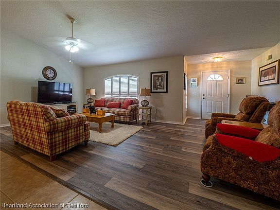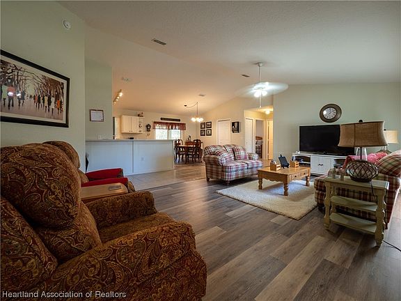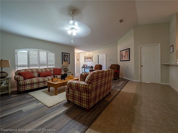 This well maintained 3 bedroom 2 bath home is nestled on a spacious meticulously manicured corner lot. Walking into the home you will greeted with new vinyl plank flooring in the living room and dining area. High Vaulted ceiling for a spacious and airy feel throughout the living area. Updated kitchen with modern cabinets and new appliances. Large master bedroom with en-suite bathroom and a spacious walk in closet. Split floor plan for added privacy offering ample sized guest rooms. Elegant plantation shutters throughout all windows of the home. Spacious rear screen porch for enjoying the outdoors bug-free with a chain link fence bordering the rear of home. Convenient two car garage with washer and dryer utilities located within. New shingle roof in Aug, 2022 and newer AC has also been installed. Only minutes from local shopping centers and restaurants. Many local lakes and outdoor activities are just a drive away for you to enjoy all the beautiful Florida scenery. You do not want to miss your opportunity of making this home yours, call to set your showing appointment today!
