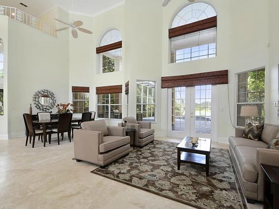 Tropical Florida home located in gated golf club community. 22 foot ceilings in Dining and Living rooms with tall ceilings throughout the rest of the house. Open floorplan with new granite countertops and stainless appliances in kitchen. Theatre room on 2nd floor with wetbar and bathroom.
