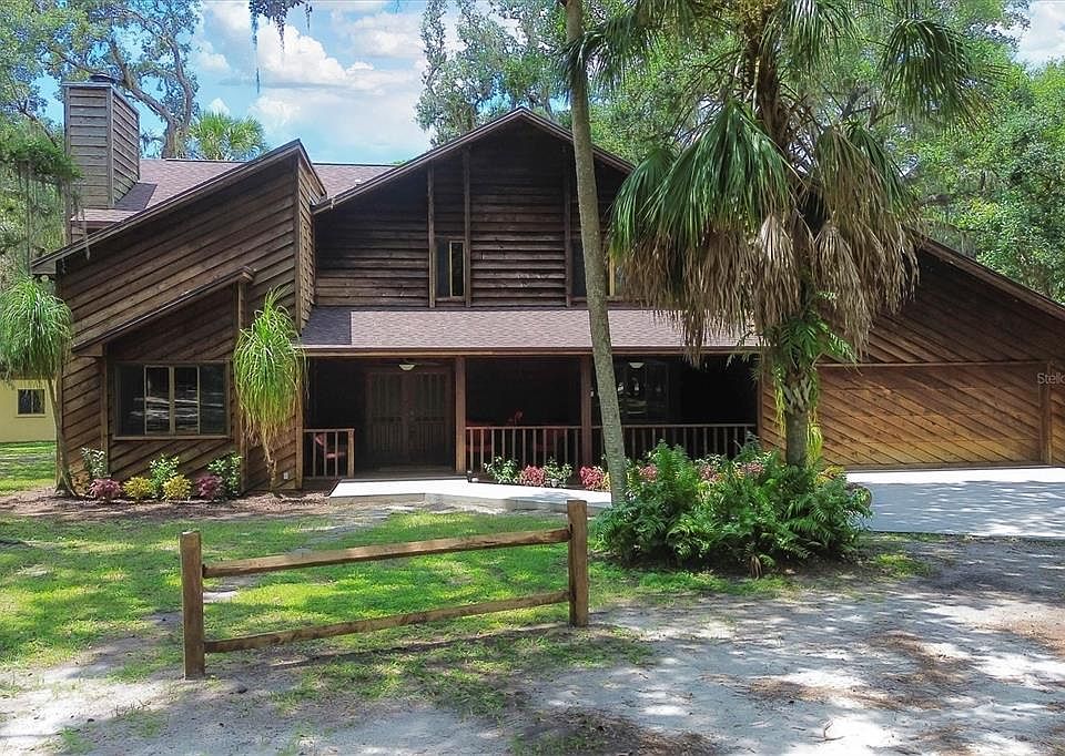 Country paradise in town! Custom-built family residence situated on 2.5 acres located west of I-75 with no HOA or CDD! Huge detached workshop/garage perfect for car collectors or hobbyists. Roof replaced in 2022 and A/C replaced in August 2024. Inviting two story design with cedar siding and ceiling beams, two stone fireplaces and enormous front and back porches to relax and enjoy the peaceful setting. Mature oak trees frame the property and provide a natural canopy of shade. Spacious kitchen in the center of the home opens to both the living and dining rooms creating an easy flowing floor plan with plenty of room for family gatherings. Bedrooms are all good size, and most open out to a screened in deck with serene treetop views. Rustic charm and character abound with wood and stone accents, built in window seats, a laundry chute, and even a quirky old-fashioned phone booth! Grand foyer entry. Attached two car garage AND giant detached workshop with an RV hookup on site too. Bring all your toys! Huge utility room plus storage area. Ideal work from home setup. This is a RARE OPPORTUNITY. Come and enjoy the luxury of peaceful privacy with acreage in close proximity to shopping, dining and easy access to I-75. This is more than just a home - it's a lifestyle. Buyer's financing fell through so this home is back on the market ... Hurry!