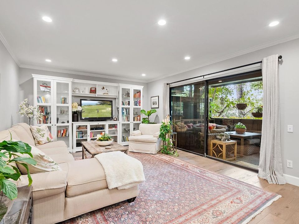 This move-in-ready condo features an open floor plan with a remodeled kitchen, quartz countertops, stainless steel appliances, and ample cabinetry. The living room includes a wall unit with glass cabinetry and engineered wood floors. Enjoy a private patio surrounded by lush greenery, plus a primary bedroom with a wall of closets and outdoor access. The second bedroom has built-in cabinets, and the remodeled bathrooms offer comfort. Additional perks include a laundry room, community amenities like pools, tennis courts, and proximity to downtown, transportation, and parks.
