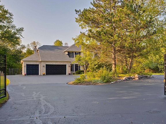 Don't miss your chance to own one of the most gorgeous properties in Long Grove on 1.5 rolling acres, fully equipped with the latest smart home tech! Brand new roof, insulated garage doors, and driveway freshly seal coated! Captivating natural surroundings and keen attention to detail set this home apart the moment you enter the private gated circle drive. A soaring 2-story foyer with grand Palladian window welcome you home, flanked by a formal living room and separate dining room filled with southern-facing natural light. Spacious, well-equipped and open kitchen ideal for entertaining with granite counters, an island with breakfast bar, a desk area, and a casual dining area. Gather in the inviting and airy family room with vaulted ceilings, exposed beams, a bay window and a floor-to-ceiling brick fireplace. Enjoy the conveniences of a private home office, powder room, and mudroom completing the main level. Upstairs, retire to your luxe master suite with tray ceiling, a sitting or dressing room, deep walk-in closet, and a versatile loft space overlooking the family room. The vaulted master ensuite bath features a dual granite vanity, separate shower, and whirlpool tub. Three additional bedrooms, each spacious and bright with ample closet storage, share a hallway bathroom with granite vanity and newly grouted tile shower/tub. Downstairs, the partially finished basement with full bathroom has incredible potential for the most amazing recreation room and home theater! Attached 3-car heated garage equipped with 60 amp Tesla charger. Other exceptional modern amenities include the privacy gate with intercom, security cameras, wifi-powered Nest CO detectors, fire alarms, and thermostat, interior sprinkler system, interior and exterior invisible fences, and reverse osmosis water filtration system. Enjoy peaceful pond views and watch for rare birds from your expansive deck with pergola, dine al fresco on the brick paver patio, and roast s'mores by the fire pit. Large dog run with basement access. Native perennial flowers, mature fruiting trees, and lush wildlife are replete in this incredible property located minutes from the Reed-Turner Woodland Nature Preserve and Heron Creek Forest Preserve. Walk to downtown Long Grove! Top-rated schools featuring renowned Stevenson High School!