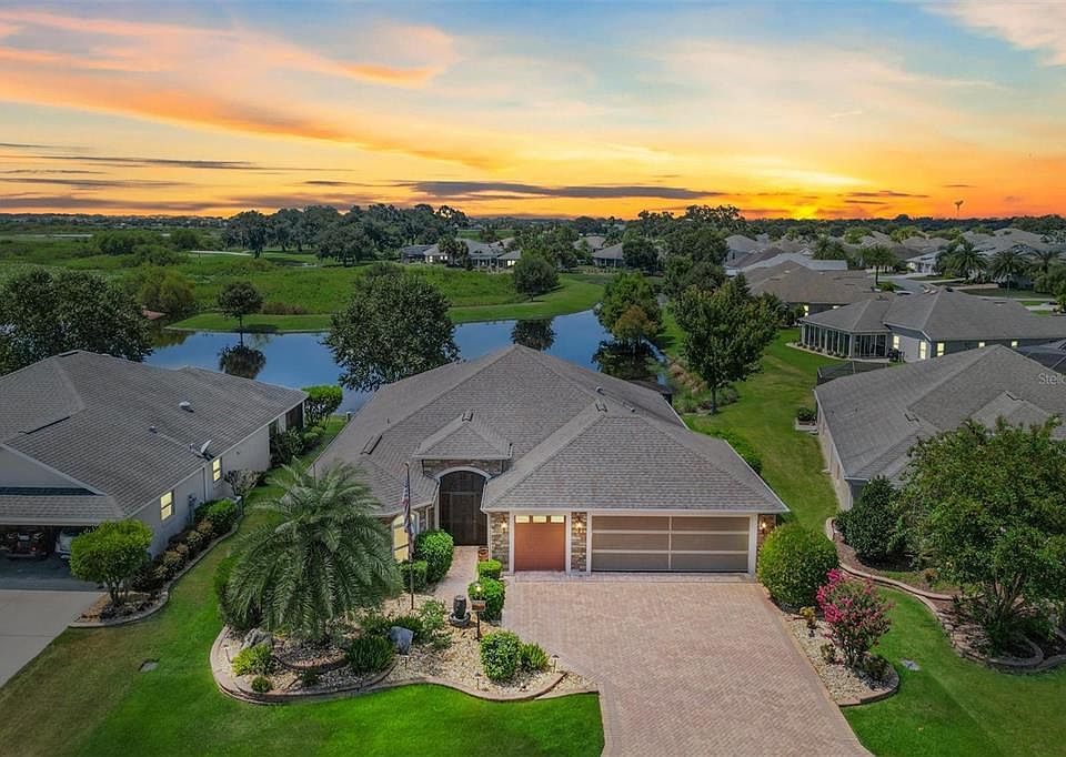 Welcome to a beautifully designed gem in The Villages, where elegance meets comfort in this stunning 3-bedroom, 2-bathroom home. The 3rd bedroom with bay window but without closet can be used as a bedroom or private getaway or den. Situated with picturesque water views, this residence is a true haven, offering a serene and sophisticated lifestyle. As you approach the property, you’ll be greeted by a charming exterior that features a combination of pavers and brick accents on the front façade, setting the stage for the quality and style that lies within. The lush, meticulously landscaped grounds enhance the curb appeal, making a memorable first impression. Step through the front door and into a hand-crafted interior that exudes warmth and refinement. The home boasts an array of high-end finishes, including crown molding and wainscoting that grace many of the main living areas. The attention to detail is evident in every corner, with white-painted wood trim framing most doorways and sliders, and plantation shutters offering both functionality and a touch of classic elegance. The heart of the home is the gourmet kitchen, designed for both beauty and practicality. It features sleek stainless steel appliances, including an upgraded refrigerator and a wall oven, paired with stunning granite countertops and a complementary backsplash. Whether you’re preparing a casual meal or hosting a gathering, this kitchen provides a stylish and efficient space for all your culinary needs. The master suite is a luxurious retreat, thoughtfully designed to offer comfort and sophistication. The tray ceiling, adorned with decorative trim, adds an elegant touch, while the custom California-style closets ensure ample storage space. The en-suite master bath is a true sanctuary, featuring dual sinks and a spacious Roman shower, providing a spa-like experience in the comfort of your own home. Throughout the residence, you'll find tile flooring in the main living areas, offering durability and ease of maintenance, while the bedrooms are enhanced with hand-scraped wood floors, adding a touch of rustic charm and warmth. The outdoor living spaces are equally impressive. The expansive lanai, glass-enclosed and air-conditioned, measures approximately 12x20 and has been thoughtfully extended to offer generous space for relaxation and entertainment. It’s an ideal spot for year-round enjoyment, whether you're unwinding with a book or hosting friends and family. Beyond the lanai, a screened-in patio area provides additional space for grilling, dining, or simply enjoying the tranquil evenings. The backdrop of the water view adds a picturesque setting, perfect for savoring sunsets and creating lasting memories. A few upgrades to point out in the oversized 2 car plus golf cart garage is the screen on the front garage door, apoxy floors in the garage for easy maintenance and a sink for those that love to spend time in the garage. To the rear of the home on the lanai are screen shades that are controlled by remote control for privacy when needed. This home in The Villages is more than just a residence; it’s a lifestyle. With its elegant design, high-quality finishes, and beautiful outdoor spaces, it offers the perfect blend of luxury and comfort. Don’t miss your chance to experience this exceptional property—schedule your showing today and step into the home of your dreams!