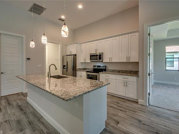 NEW CONSTRUCTION - TO BE COMPLETED END OF MARCH FOR AN APRIL CLOSING! This 4 Bedroom, 3 Bath, 2 Car Garage home comes with all the Bells and Whistles. Home is 2,010 sq ft under air with a total of 3,998 sq ft when you include your 1,402 sq ft lanai with an oversized pool. The Kitchen has been decked out with 42" All Wood Cabinets, Stainless Steel Appliances, Quortz Countertops, and a huge Kitchen Island. Designer plank tile flooring installed throughout the whole home. This home has a Paver driveway, Paver pool deck, complete landscape package with sprinkler system and flora tan sod. The interior specs are 12' Ceiling in living area, 8' doors, 5 1/4" Baseboard with 3 1/4" Casings, Soffit lighting outside, Frameless Glass Shower Enclosure, Stand Alone tub in the master bath, Trey Ceilings in the living room and master bedroom, pendant lighting in the kitchen, pool bath and so much more. This home is located in the desirable SW section of Cape Coral and comes with a 1 year builder warranty