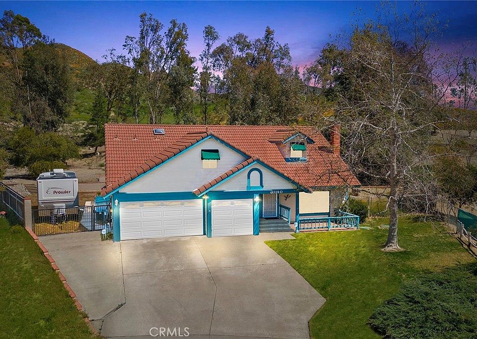 VIEWS!! LOW TAXES AND NO HOA! This home is located in Victorian Estates on the LARGEST LOT in the neighborhood! Sitting on just over 1 acre of land with RV parking, tons of mature trees, a wonderful patio cover in a park like setting. This 2,330 sq. ft. home features a very open floor plan that has it all. Enjoy 4 oversized bedrooms, 3 full baths, a large formal living room with fireplace and spacious family room. Downstairs you'll find a bedroom w/ full bath, formal dining area, indoor laundry, and a 3 car garage. Upstairs you'll enjoy a large master bedroom, jack-and-jill bedrooms, and a bonus work room/area perfect for reading or crafts. This home has so much potential just waiting for its next family to make this their home. The backyard is like a park with beautiful views and RV parking.