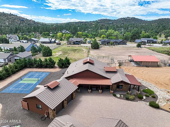 Experience the charm of custom craftsmanship with this exquisite Western-style estate, nestled just minutes from downtown Prescott on a 3.2-acre lot. The primary residence, is 2,689 sq ft of elegantly appointed living space, features 10-foot coffered ceilings, 8-foot doors, clear alder wood cabinetry, granite countertops, generous closet space, extensive storage, and a sizable laundry room. The open-plan living area is ideal for unwinding and hosting friends and family. The charming 1 Bed/1BR 614-square-foot guest house has its own garage included. This extra space is perfect for long-term family visits, a home office, or as a rental. Horse enthusiasts will appreciate the expansive outdoor area, which includes a two-horse stable with a tack room and heated water, a corral, and arena.