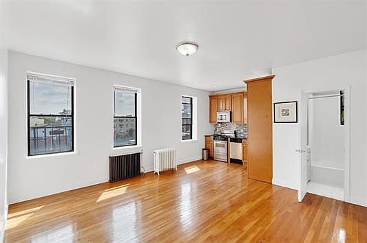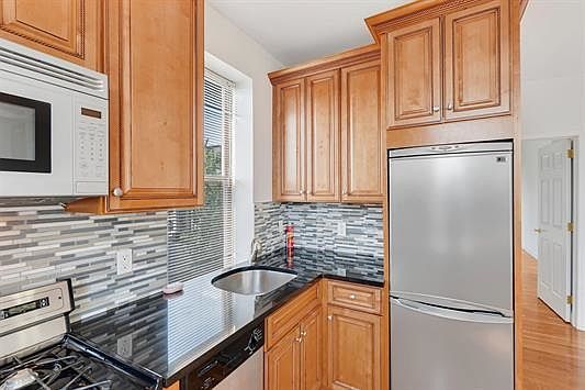 This top-floor unit offers an inviting open floor plan, featuring a spacious living room that flows seamlessly into the kitchen area. The kitchen is highlighted by a beautiful countertop, stylish backsplash, and a window that allows sunlight to flood the space. The unit boasts hardwood floors throughout, adding warmth and elegance. The generously sized bedroom includes a wall-to-wall closet, providing ample storage. The modern and clean full bath is finished with ceramic tile and a tub, offering both style and comfort. Natural light pours into the unit from the large windows, creating a bright and airy atmosphere. Located in an elevator building with a commercial capacity washer and dryer room and an on-site super, this unit is perfectly situated close to Bergenline and Park Avenue. You'll be near a bustling commercial district filled with restaurants, shops, boutiques, and more. The building is also conveniently located on the corner of a major bus line hub, offering a commute to New York City in under 10 minutes truly a commuter's dream!