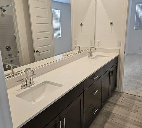 Brand new, never lived in, single-family home Lennar home located in Hawes Crossing in Mesa. Open, great room floorplan plank tile floors and one bedroom and bathroom downstairs (w/walk-in shower). Kitchen includes white quartz countertops, slate/espresso cabinets, stainless appliances and a walk-in pantry. Main suite features barn door to bath, walk-in, porcelain and glass shower, double sinks, make-up desk and walk-in closet. Upstairs hall bathroom has double sinks, quartz countertops and a shower/tub. Community amenities include a swimming pool, basketball court, pickleball court, playground and picnic area. Easy access to Loop 202, US 60 and Phoenix-Mesa Gateway Airport. Gilbert school district.