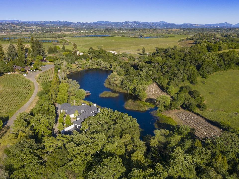 Jolie Vue is a gated private estate property on 16+/- acres with a 4+/- acre lake less than 10 minutes to Healdsburg Plaza. The home has been extensively remodeled 2020-2021 and includes three suites, grand room, formal dining room, gourmet kitchen and office. Guest quarters with living room and bedroom also overlooks the lake. Three distinctive wood burning fireplaces grace the main house including one in the lake view master suite. The outdoor dining area also overlooks the lake and has a wood burning fireplace. Additional outdoor living is provided by a recently built screened in floating boathouse with deck. The large 3 car garage and shop area includes a separate restroom with outside access. Lush landscaping includes willow, oak, pine and peach trees and a garden area. There is also a shop and garage as well as an adjacent site for a cottage overlooking the lake at the entrance to the property. The managed vineyard consists of 1.3+/- acres of pinot.