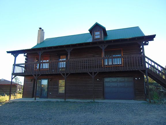 Cozy log home situated on 35 acres with views of Fisher Peak from the back deck and views of the Spanish Peaks from the front deck. Home needs some TLC and some updating but good to move into as is. The main level has kitchen and great room with vaulted ceilings and then 2 bedrooms and a bath. Upstairs is large loft bedroom with bath. Basement consists of half family room w/half bath and a one car garage. Outbuildings consist of a one car detached garage, 24x36 barn and a 24 x 40 barn. Sellers offering a flooring allowance of $8,000 to update carpets.