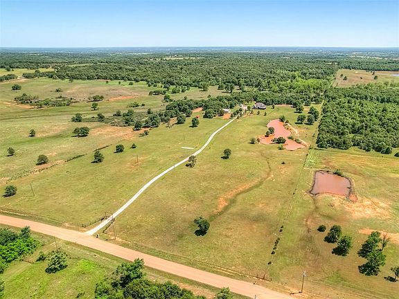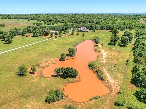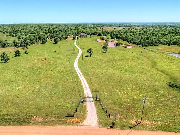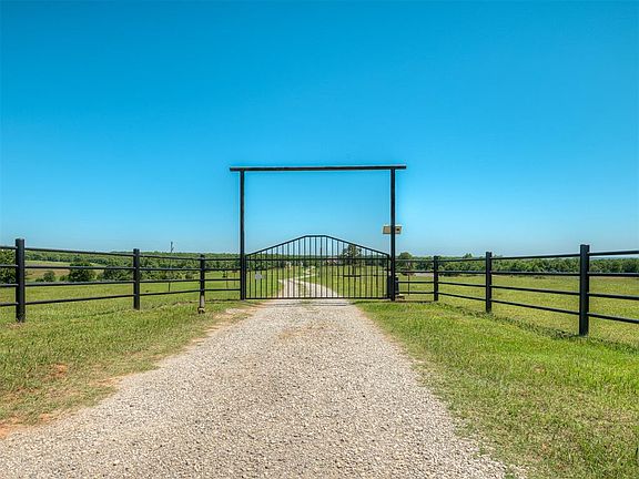 Nestled on 30 acres, this beautifully designed ranch-style home offers a serene & private lifestyle. The property is fenced for horses & cattle, making it an ideal setting for agricultural or recreational use. A remote-controlled gated entrance invites you onto the land, where a long, scenic driveway winds through the center of the property, leading to the home’s striking exterior. With a mix of brick, stone, and stucco, along with architectural peaks & a charming wraparound front porch, the home boasts undeniable curb appeal. Picture yourself relaxing on the storybook porch swing, taking in panoramic views of the pasture & large front pond. This thoughtfully designed home features 3 bedrooms, 3 full bathrooms, & a study. Inside, engineered wood flooring flows throughout, complementing the rustic wooden beams & high ceilings in the expansive living room. Enjoy the ambiance of a floor-to-ceiling stone fireplace & an abundance of natural light through the windows. The chef’s kitchen is a showstopper with a center island, granite countertops, a farmhouse sink, stainless steel appliances, generous white cabinetry, & a large walk-in closet. The primary suite is tucked away on its own side of the home. It features a vaulted ceiling with an exposed wooden beam, private patio access, & a spa-like ensuite bathroom complete with double vanities, a freestanding tub, & a tiled walk-in shower. Secondary bedrooms are located on the opposite wing of the home. One bedroom includes its own full bathroom, & an additional full bath serves the third bedroom and common areas. The laundry room includes a utility sink & storage. The expansive covered back patio is perfect for entertaining, or enjoying tranquil evenings after a day on the ranch. Additional features include: 40x50 Workshop with electricity, generac generator, a storm safe room, an additional storage outbuilding, & 2 ponds. Don’t miss your chance to own this extraordinary piece of Oklahoma countryside!