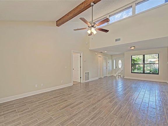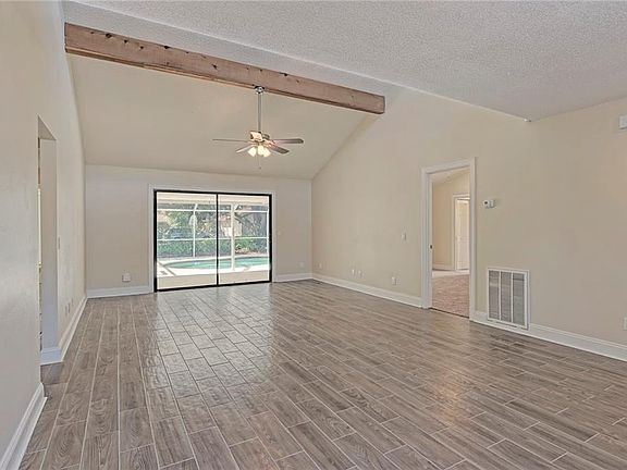 MOVE-IN READY beauty! This 3 bedroom, 2 bathroom home is bright and open throughout with new plush carpet in all the right places, new wood look tile plank flooring and new two-toned paint throughout! Stone walk way leads to front entrance. Bright open living area off entry with large windows showcasing tons of natural light, and vaulted ceilings. Gorgeous well equipped kitchen with new cabinets, granite counter tops, full length breakfast bar, and new stainless steel appliances. Carpeted master bedroom boasts vaulted ceiling, exit directly to patio, deep walk in closet with built in organizer, and en-site bathroom offering tiled walk in shower. BIG patio of rear sliding door exits overlooks sparkling screened in pool with wooded view. Perfect for entertaining! Hurry up and see this one today! You are going to love this home!!