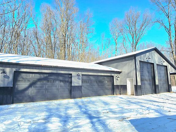 Hunter's Paradise!!! Ranch home with finished walk-out basement nestled on over 30 wooded acres. 32'x48' Pole Barn w/ 16' ceilings & 14' doors w/ openers (2025) with attached 14'x48' Lean-To and 24'x44' 4-Car Garage. Barn and Garage are both finished with electric, spray foam insulation, and concrete flooring. Barn section is also heated. Home features 9' ceilings throughout, high-efficiency furnace (2023), tankless on-demand water heater (2023), reverse osmosis system (2023), insulated basement walls, and 5" gutters. View the sunrise over the pond from your back deck. Explore the trails, pond, creek, multiple tree stands, and wildlife all within this private country setting.