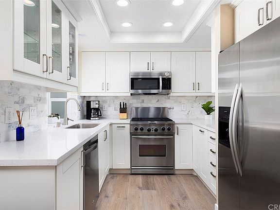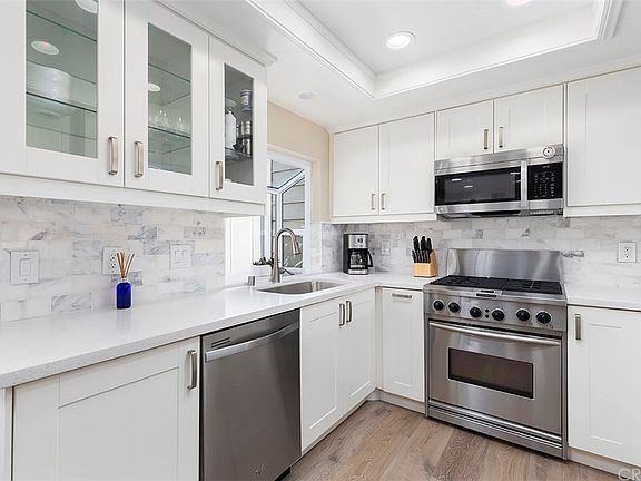 Beautifully remodeled and close to the beach! Located in the highly sought after Marinita Townhomes in Dana Point, this impressive home features a light and bright living room with soaring ceilings and two master suites. As you enter the home, you are greeted with stunning hardwood floors that flow to the remodeled kitchen with Quartz countertops, a Carrera marble backsplash, stainless steel appliances, a gas stove, and a garden window to enjoy the view of the backyard patio and lush landscaping. The laundry room is conveniently located inside the home near the kitchen. Ascend the staircase under the skylight to the two upstairs en suite bedrooms. In the main master bedroom you'll enjoy a fireplace, two closets, and a luxurious remodeled bathroom with Quartz countertops, two sinks, beautiful cabinetry, and an oversized Carrera marble "step in" master shower. The second spacious en suite bedroom also features a remodeled bathroom. This home offers many additional features including recessed lighting, dual-paned windows, direct access to a two-car garage and much more. The gated Marinta Townhomes offer an association pool, two spas, a tennis court, and a clubhouse with outdoor barbecues. Conveniently located near the Dana Point Harbor, Doheny & Salt Creek beaches, 5-star hotels, movie theaters, gym, shops, and restaurants.