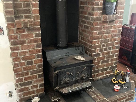 Wood burning stoveFenced in front yardOffstreet parkingCentral heatLarge backyardGas stoveHardwood floors