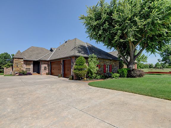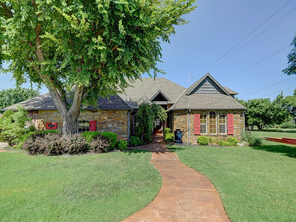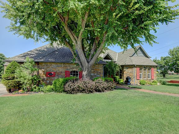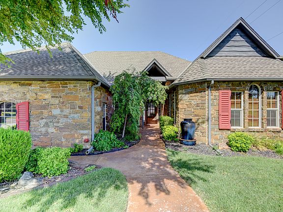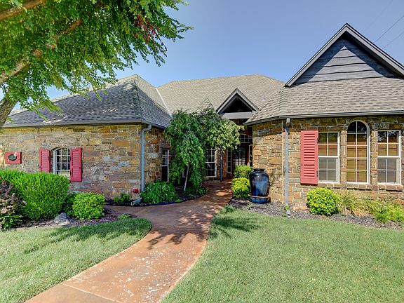 This stunning home is a dream! The gorgeous living room impresses with soaring vaulted ceilings, wood beams enhancing the pitch, large bright windows, a double sided brick fireplace, and wet bar for entertaining. The true study features built ins and crown molding. In the kitchen you'll find granite counters, double ovens, new dishwasher, pantry, tile backsplash, and arched doorways. The master oasis is a gem with a double sided fireplace that is also shared beside the whirlpool tub, double vanities, walk in tiled shower, built in hutch, and beautiful tray ceiling. The master leads to a large sun room boasting sweeping views of the backyard and trees beyond! Home also includes a storm shelter and formal dining. Matterport virtual walk through available in Virtual Tours.
