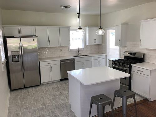 Completely remodeled 2BR, 1 BA. Refinished wood floors, new cabinets and counters, new tile, tub, shower, sinks faucets, etc. Stainless appliances. 2 car garage and fenced backyard. Central heat and air. No pets.