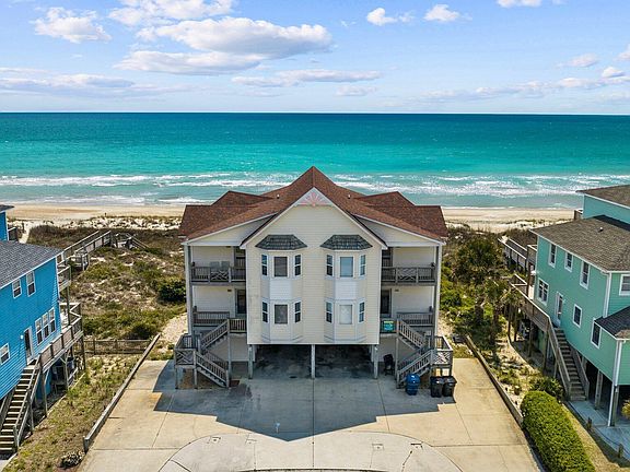 Rarely available oceanfront 1/2 duplex with private separate ocean access walkway on deep lot with wide beach. This 5 bedroom/5 full bath design is distinctive and seldom available. The reverse floor plan offers living/kitchen/dining and bedroom suite on top level, 3 bedrooms with on-suite baths and laundry closet on the middle level, and a grand bunk room with wet bar on the ground level, plus carport and enclosed outdoor shower. All levels enjoy ocean views, ocean side decks & patio with access down to the beach. Floor coverings consist of wood in main living area, tile in baths and carpet in bedrooms. Offered furnished. Not a rental, but excellent rental potential. Easy to show.