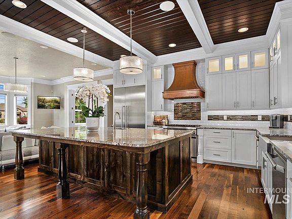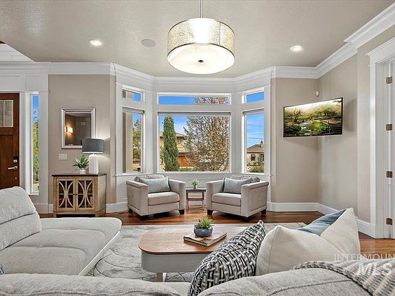 This Crescent Rim residence is a meticulously designed masterpiece ideal for both indoor and outdoor entertaining. Situated on nearly half an acre in one of Boise's most prestigious neighborhoods, it offers breathtaking views of downtown and the foothills. The interior features expansive windows, walnut hardwood floors, custom woodwork, and a gourmet kitchen with Thermador appliances. Main level Mother-in-law quarters or use as a private guest suite with patio access. The primary suite includes a private balcony, heated tile floors, his and hers closet with laundry and additional versatile space. The property also boasts a movie/media room, game/pool table room, and a private backyard with an outdoor kitchen, spa, and waterfall. With a spacious 4-5 car garage and pristine landscaping, this home combines luxury with functionality for the ultimate living experience. One of Boise's Best locations minutes to downtown, Boise River, Greenbelt, restaurants & more.