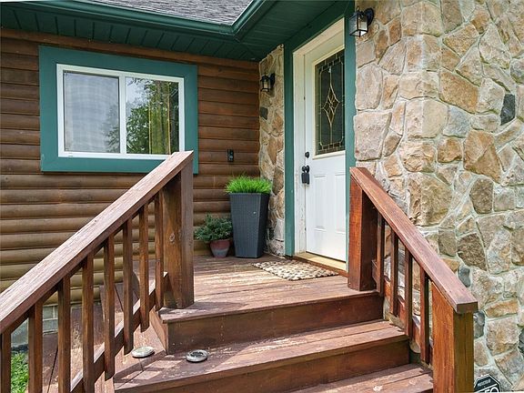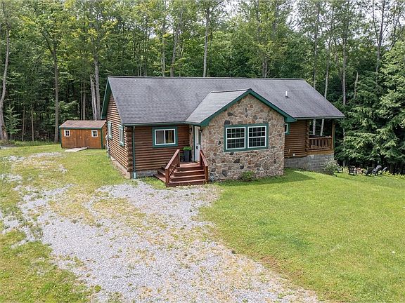 Come see the WOW factor!, log home ranch style (very expensive replacement), 7+ acreage private setting, over 1200' frontage, year round on year round road, Close to Olean and Seneca Allegany Casino, Tastefully decorated with soft neutral colors, Cathedral ceilings, natural trim, open floor plan makes for spacious entertaining area, wrap around deck for view of woods, All appliances included, oil fueled forced air heat with central air, lower level offers pellet stove for ancillary heat just in case. Abundant well water, electric, 2005 septic system. Very cool light fixtures and amble recessed lighting. Storage shed.
