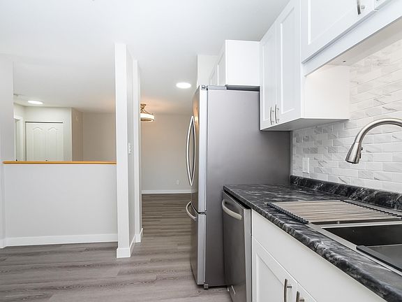 Like Brand New! New vinyl floors through the entire unit. The Kitchen has new cupboards, new counter tops and new backsplash, new stove (balance of appliances were bought recently). The home has been completely painted. New bathroom cabinets and counters. Super open and bright with big patio doors which allows you to walk out to the grass on ground level (great for pets - 2 allowed). Located centrally with easy access to shopping, bus stop or the freeway. Gas fireplace (cost for gas included in your strata fees. One underground parking spot with a second one available for rent. Storage locker included. No Rentals. OPEN HOUSE SUNDAY 1-3 PM