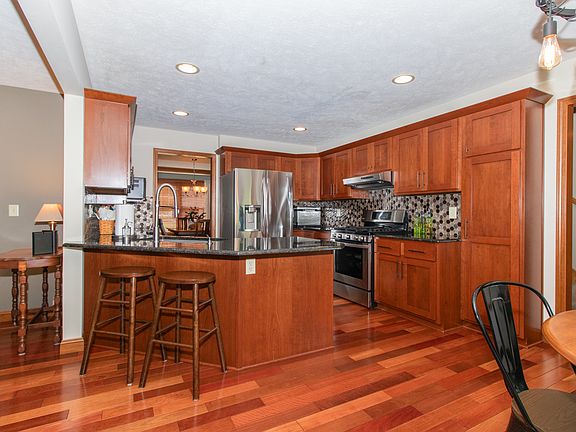 Welcome to this beautiful 4-bedroom, 3.5-bathroom home with a 3-car garage, nestled on a large lot. This one-owner property showcases a two story entry way and stunning Brazilian cherry hardwood floors and crown molding throughout. The main level offers an eat-in kitchen with granite countertops, a formal dining room with a tray ceiling, a family room with built-in bookcases surrounding a gas log fireplace and separate living room. The updated eat-in kitchen has granite counter tops with breakfast bar. There is a built-in pantry as well as a separate pantry closet. The home features two separate staircases leading to the second floor, where you'll find spacious bedrooms and walk-in closets. The primary suite includes a cathedral ceiling, an updated bathroom with a tiled shower with dual shower heads, two separate vanity areas, large walk-in closet, and luxurious touches such as a heated towel bar and a timed fan to control humidity. Convenience is key with first-floor laundry and additional laundry hookups in the finished basement. The home is equipped with a high-efficiency HVAC system with an upgraded filter and whole-house humidifier installed in 2011, a sump pump with radon pipe installed and newer hot water heater (2018). The garage has extra insulation, insulated garage doors and offers an extra workshop space with a gas heater. The roof has lifetime shingles. Outside, you'll enjoy an oversized patio perfect for entertaining, beautiful landscaping with several mature trees and one of the larger lots in the neighborhood. This home is move-in ready and filled with thoughtful upgrades throughout.
