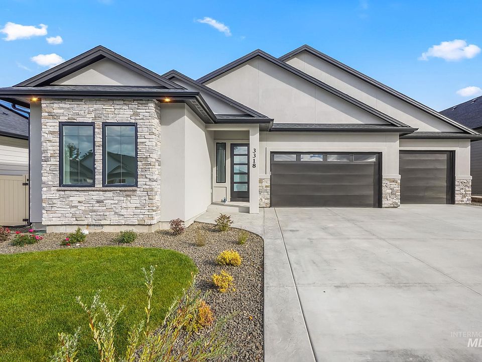 Beautiful, single level home with 4 car garage in Meridian's Timberline Sub. Open space design with fine finishes throughout, spacious kitchen, grand room and eating area. This home features an En Suite and separated bedrooms allowing guests to stay comfortably. Kitchen is well equipped with built-in double ovens, expansive island, and wine fridge. Primary suite has tall ceilings, lots of light and a spacious bath with dual vanities, double doored tile walk-in shower, freestanding soaker tub, and a large walk-in closet. Tall 8' doorways throughout the home and large sliding door to the covered patio and east facing backyard. Tankless hot water heater with on demand hot water, only takes a few seconds to deliver. 3rd garage bay is 35' deep.