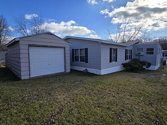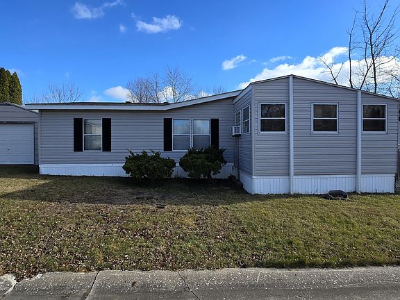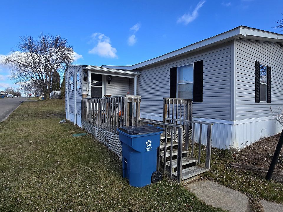 Double-wide 3 bed 2 bath mobile home on leased land. Updates include new furnace and ducts, water heater, heat tape, floor insulation in November 2023. Fenced in yard, detached one car garage, enclosed porch sitting on a corner lot. Located in Wood Dale Mobile Home Park. Cash purchase only.