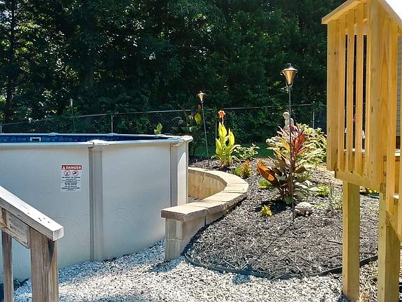 Large screened in porch, above ground pool, 2 car carport, shed. Patio for fire Pit.