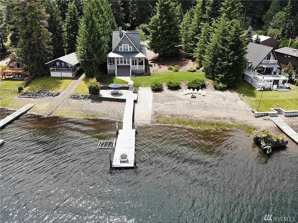 This is your Lake Cavanaugh dream property! 2 tree lined parcels for privacy on 1 acre with 133' no bank lakefront. 80' private dock, concrete beach patio, huge sandy beach & best of all launch your boat from your own boat ramp! Main house has vaulted ceilings on both floors, cherry floors & cabinets, wrap around covered deck, propane radiant in-floor heat w/90 gal. water tank. 2 stall garage with shop and 725 sq. ft. guest house above. Plenty of room for more development on this rare lot.