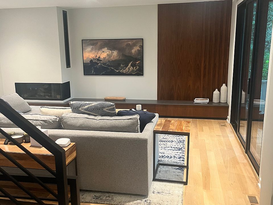 It includes an oversized west elm sofa; large Samsung TV that can double as custom wall art when not in use; a one-of-a-kind imported gas fireplace; hidden outlets to minimize cords but still accommodate even the most elite tech junkies; ample recessed lighting; and a striking wood and concrete panel accent wall and fireplace ledge.