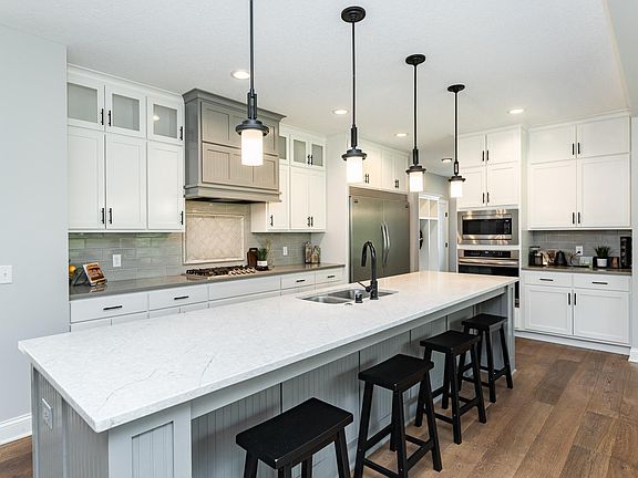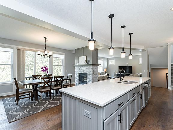 Step inside to find a chef’s kitchen with an enormous 13' center island offering ample storage, a gas cooktop, commercial-grade refrigerator, stainless steel appliances, quartz countertops, and a spacious walk-in pantry. A beautifully designed two-sided gas fireplace connects the dining room and the living room, while an additional custom stone fireplace anchors both the main living room and the lower-level family room, adding warmth and elegance.